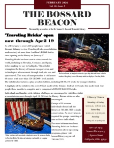 FEBRUARY 2026 Vol. 10, Issue 2 The monthly newsletter of the Dr. Samuel L. Bossard Memorial Library THE BOSSARD BEACON ‘Traveling Bricks’ open As of February 1, over 1,600 people have visited Bossard Library to view Traveling Bricks, an exhibition made entirely of more than 1 million LEGO® bricks, since opening at the library on January 17. Traveling Bricks has been seen in cities around the world, including in Slovakia, Germany, and Spain, before making its way to Gallipolis. This exhibit reimagines the history of human transportation and technological advancement through land, air, sea, and space travel. This story of transportation is told across 60 scenes with more than 120 LEGO® brick models. The exhibit also features a play area for children, including DUPLO® bricks for younger children. A highlight of the exhibit is the over 20-foot model of the Titanic. Built at 1:40 scale, this model took four people three months to complete and is comprised of 200,000 LEGO® bricks. Individuals and families with children of all ages are encouraged to visit this exhibit at no admission cost through April 19, 2026 at the library. Return visits are also encouraged. Groups of 10 or more individuals should call the library at 740.446.7323 to make a reservation. No reservation is required for groups consisting of nine or fewer individuals. For more information about Traveling Bricks or the latest information about upcoming programs, please visit bossardlibrary.org or call 740.446.7323. 740.446.7323 bossardlibrary.org 7 Spruce Street Gallipolis, Ohio 45631 Library Hours Monday - Friday 9:00 a.m. to 8:00 p.m. Saturday 9:00 a.m. to 5:00 p.m. Sunday 1:00 p.m. to 5:00 p.m. The Icarus Dream, an imagined version of a space ship that could travel to the far reaches of the galaxy, is one of the many models on display at Traveling Bricks. Viking warriors can be seen inside a longboat in one of the scenes on display in Traveling Bricks. The ships and seafaring vessel models are a popular portion of the exhibit.